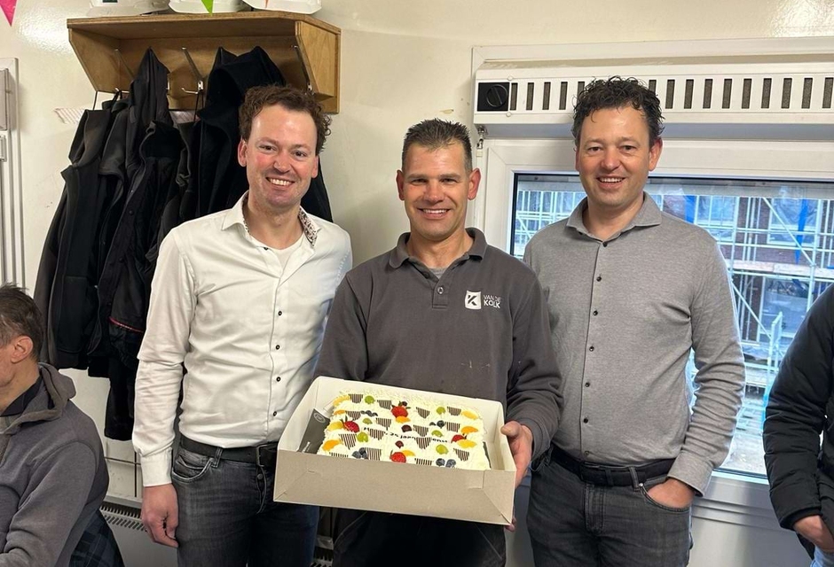 Vanmorgen werd Henry door Peter en Henk van de Kolk verrast met een heerlijke slagroomtaart.
